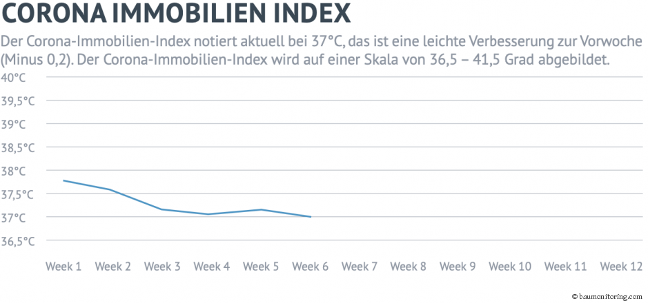 Die Fieberkurve des Corona-Immobilien-Index ist gesunken und zeigt aktuell 37,0 Grad. Das ist der niedrigste Wert seit Beginn der Messung vor sechs Wochen. Der Corona-Immobilien-Index wird auf einer Skala von 36,5 – 41,5 Grad abgebildet. In Bezug auf die menschliche Körpertemperatur gibt der Index die Lage auf dem Immobilienmarkt an. Bei 36,5 Grad gibt es keine Beeinträchtigungen, alles ist in Ordnung. Nehmen die Probleme auf den Baustellen zu, steigt die Temperatur bis hin zum Fieber, maximal 41,5 Grad. Dann geht nichts mehr = kompletter Baustopp.
