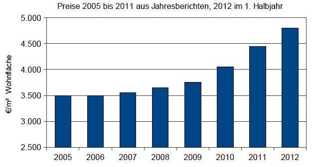 4.750 Euro pro Quadratmeter mussten Käufer durchschnittlich im ersten Quartal 2012 in einer guten Wohnlage in München investieren, wenn sie eine Wohnung kaufen wollten. Das sind 300 Euro mehr als ein Jahr zuvor. 2005 lag der Quadratmeterpreis noch bei 3.500 Euro. Im ersten Quartal dieses Jahres betrug der Durchschnittspreis für das gesamte Stadtgebiet München 3.692 Euro. Damit nimmt die bayerische Landeshauptstadt weiterhin den Spitzenplatz in Deutschland ein. Auch die Preissteigerung von beinahe 40 Prozent in den vergangenen fünf Jahren ist einzigartig. Dieser Trend beschränkt sich allerdings nicht auf München, sondern ist im gesamten Bundesgebiet zu erkennen. In Hamburg mussten Käufer in den ersten drei Monaten 2012 durchschnittlich 3.692 Euro pro Quadratmeter investieren. Gut 36 Prozent mehr als 2007. In Frankfurt am Main waren es 2.427 Euro. Ein Anstieg von 22,5 Prozent seit 2007. In Düsseldorf zahlten Käufer mit 2.237 Euro fast 25 Prozent mehr als noch vor fünf Jahren. Und auch das einst attraktiv-günstige Berlin wird teuer. Zwar lag der durchschnittliche Quadratmeterpreis in der Hauptstadt im ersten Quartal 2012 bei vergleichsweise geringen 1.899 Euro. Seit 2007 ist aber ein Anstieg von 31,8 Prozent zu verzeichnen. Nach München, Regensburg und Hamburg der viertstärkste der Republik.