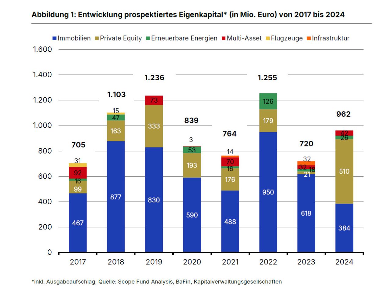 Die jüngste Erhebung zum Markt der geschlossenen Publikums-AIF ergab für 2024 elf neu von der Bafin zugelassene Immobilienfonds mit einem geplanten Eigenkapitalvolumen von 384 Millionen Euro. Das ist das geringste Neuangebot in dieser Assetklasse, das Scope je gemessen hat. Die Ratingagentur erklärt den Rückgang mit der starken Konkurrenz durch festverzinsliche Anlageformen und mit der „schwierigen Situation an den Immobilienmärkten“. Gerade erst berichtete der Maklerverbund German Property Partners (GPP) mit Blick auf das erste Halbjahr 2025 vom niedrigsten Transaktionsvolumen mit Gewerbeimmobilien in Deutschland seit 2009.