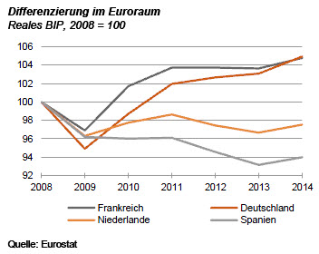 Die herrschende Vorstellung des Euroraums ist falsch. Normalerweise teilen wir die Währungsunion auf in die Problemländer im Süden (inkl. Frankreich) und in das gesunde Zentrum in der Mitte unter anderem mit Deutschland, Österreich, den Niederlanden und Finnland. Schauen Sie sich jetzt aber die Grafik an. Dort sieht das ganz anders aus. Das reale Bruttoinlandsprodukt hat sich seit dem Höhepunkt der Wirtschafts- und Finanzkrise 2008 von den dort aufgeführten Ländern in Frankreich am besten entwickelt. Deutschland (und – nicht aufgeführt – Österreich) folgt mit kleinem Abstand. Dann kommt lange, lange nichts. Im unteren Teil der Grafik finden sich erst die Niederlande und dann Spanien.