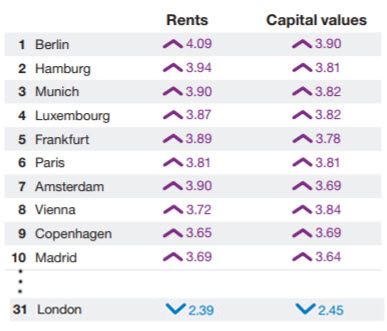 In Großbritannien geht die überwiegende Mehrheit der Investoren (80%) dagegen von fallenden Immobilienwerten aus. Rund 70 Prozent gaben an, sie rechneten mit einer Reallokation der Investitionen in andere europäische Länder. London ist daher die einzige Stadt, in Europa, in der für 2018 mit sinkenden Mieten gerechnet wird.