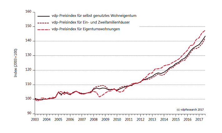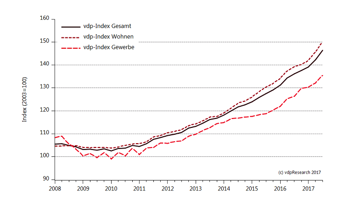 Die Immobilienpreise in Deutschland sind auch im dritten Quartal 2017 weiter gestiegen. Der vdp-Immobilienpreisindex, der im Auftrag des Verbandes deutscher Pfandbriefbanken (vdp) errechnet wird, legte um 7,7 Prozent im Vergleich zum Vorjahresquartal zu. Vor allem die starke Preisentwicklung bei Mehrfamilienhäusern und Büroimmobilien sorgte für einen Anstieg des Index. Auch die Nachfrage nach Eigentumswohnungen und Eigenheimen war ungebrochen hoch. Die Preise stiegen entsprechend dynamisch.
