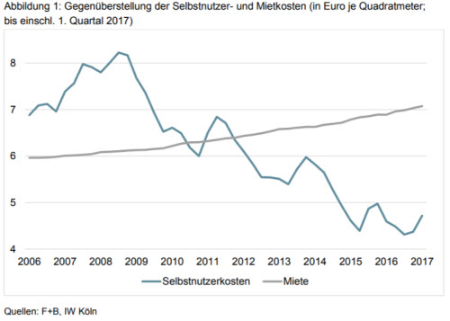 Trotz dieser Entwicklung lohnt sich ein Kauf mehr als ein Wohnen zur Miete. Zu diesem Ergebnis kommt eine Studie des Instituts der Deutschen Wirtschaft in Köln. Deren Experten verglichen über in einen Zehn-Jahres-Zeitraum die Kosten der Selbstnutzung und der Miete in allen deutschen Kreisen miteinander. Grundlage der Berechnungen war ein Ausgangsszenario, das eine Eigenkapitalisierung von 20% vorsieht; ferner eine Tilgung nach weiteren 25 Jahren. Auf die einmaligen Anschaffungskosten berechneten die Kölner Wirtschaftsforscher Beträge für Instandhaltung, Grundbucheintrag sowie eine prognostizierte Kaufpreisänderung der Immobilie mit ein. Diese Kosten wurden mit den lokalen Mieten. Die Mietpreissteigerung wurde moderat mit 1,5 Prozent angenommen.