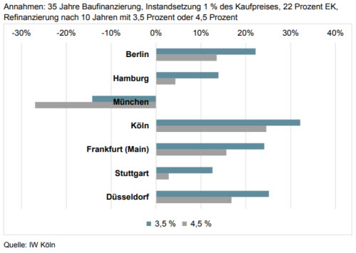 Unter Berücksichtigung der Annuitäten kommen die Forscher zu einem ähnlichen Ergebnis. Basis ist hier eine Finanzierung mit 22% Eigenkapital. Es werden keine Opportunitätskosten festgelegt und für die ersten zehn Jahre die Höhe der monatlichen Belastung auf der lokalen Miete gesetzt. Für die anschließenden 25 Jahre wurde eine Anschlussfinanzierung mit erhöhten Zinssätzen (Szenario A 3,5%; Szenario B 4,5%) durchgespielt. Trotz des unterstellten Zinsprungs lohnt sich immer noch Eigentum vor Miete. Deutschlandweit sinkt die Vorteilhaftigkeit allerdings von 33% auf 25% ab.