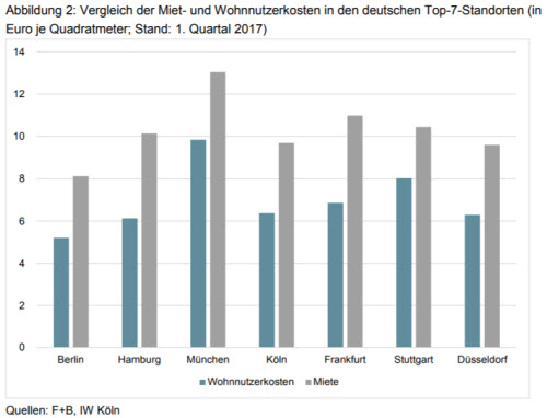 Selbst in den sieben großen Metropolen (Berlin, Hamburg, München, Köln, Frankfurt, Stuttgart, Düsseldorf) liegen die Mietkosten deutlich über den Wohnnutzerkosten (siehe Abbildung 1).Als Beispiel führen die Forscher Berlin an. Hier seien die Mietkosten pro Quadratmeter auf 8,12 Euro geklettert. Selbstgenutztes Wohneigentum koste allerdings nur 5,20 Euro/qm. Die Selbstnutzung sei daher 36% günstiger gegenüber der Miete. In Hamburg liegt die Vorteilhaftigkeit sogar bei 40%. Spitzenreiter ist erneut die bayerische Landeshauptstadt München. Die Mietkosten betragen hier im Schnitt 13,05 Euro/qm, die Selbstnutzung 9,84 Euro.