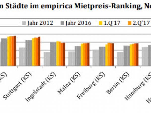 Seit Beginn der empirica-Aufzeichnungen 2004 sind die Preise für neue Eigentumswohnungen deutschlandweit um 46,3 % gestiegen. In den kreisfreien Städten (bspw. München) legten sie sogar um 65,1 % zu. Etwas moderater fiel die Preisentwicklung in den Landkreisen aus (+35,6 %).Als mit Abstand teuerstes Pflaster präsentiert sich einmal mehr München. Sowohl die Mietpreisentwicklung als auch die Preiserhöhungen in den Segmenten Eigentumswohnung sowie Ein- und Zweifamilien-Haus fielen in der bayerischen Landeshauptstadt am höchsten aus. (Siehe Bildergalerie).