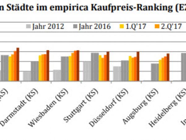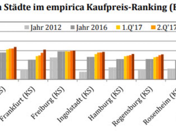 Die Preise für Eigentumswohnungen in den sieben größten Immobilienstandorten sind auch im vierten Quartal 2017 gestiegen. Nach Angaben des empirica-Institut kletterten sie im Jahresverlauf um 9,5 % nach oben. In den 14 B-Städten lag die Teuerung bei 7,6 %.