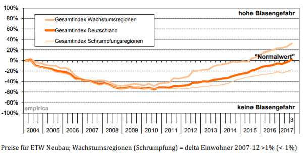 In den Großstädten bleibt die Blasengefahr nach wie vor groß. „Blasen sind durch Spekulation entstandene Preisauftriebe, die nicht mehr fundamental aus der Relation von Angebot und Nachfrage zu rechtfertigen sind“, erläutert Braun. Das Fatale ist die zugrunde liegende Entwicklung. Durch die Ertragserwartungen kommt es zu Fehl-Allokationen. Immer mehr Wohnungen werden gebaut. Solange die Nachfrage das Angebot rechtfertigt, besteht keine Gefahr. Vor allem wegen der Entwicklung in den großen und mittelgroßen deutschen Schwarmstädten steigen die Indikatoren einer Immobilien-Blase weiter an.