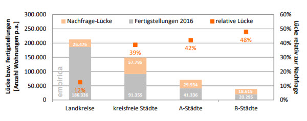 Auch die Mieten legten zu, stiegen allerdings deutlich weniger stark als die Eigentumspreise. In den A-Städten lag die Wachstumsrate bei 5,9 % in den B-Städten bei 5,0 %. Besserung ist nach Angaben von Dr. Reiner Braun, Diplom-Volkswirt bei empirica, weiterhin nicht in Sicht: „Die Mieten werden noch solange steigen, bis die Kluft zwischen Nachfrage und tatsächlichen Fertigstellungen geschlossen ist“. Derzeit fehlten jährlich etwa 80 Tsd. Wohnungen.