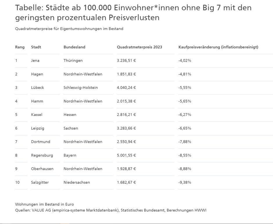 Das HWWI hat die Kaufpreise für Eigentumswohnungen in Deutschland analysiert. In fast alle Regionen sind diese inflationsbereinigt günstiger als im Vorjahr.