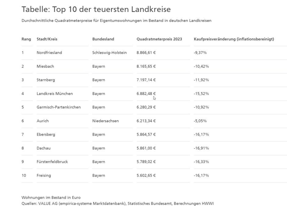 Den Preisatlas hat das Hamburger Weltwirtschaftsinstitut (HWWI) für die Postbank berechnet. Er zeigt, in welchen Regionen die Preise besonders stark gefallen sind und wie hoch der durchschnittliche Quadratmeterpreis 2023 lag.