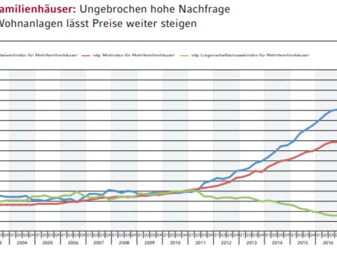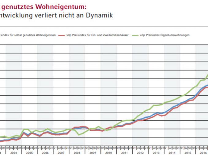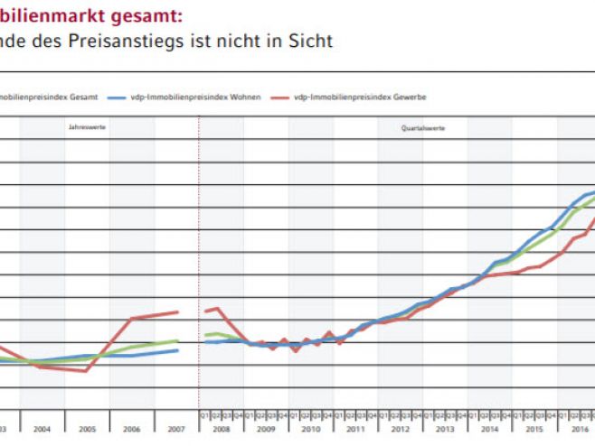 Seit 2010 sind die Preise für Immobilien gemäß dem vdp-Immobilienpreisindex segmentübergreifend um 38,3 % gestiegen. Zugpferd der Entwicklung waren Wohnimmobilien, die mit einem Plus von 40,5 % deutlich vor gewerbebauten liegen (+31,8 %). In den letzten sieben Jahren hat auch das Tempo auf dem Wohnungsmarkt deutlich angezogen. Mit einer Steigerung von 6,9 % maß der vdp die höchste Preissteigerung seit 2010. Im Vorjahr hatte der Anstieg nur 6,5 % betragen.