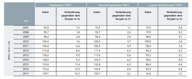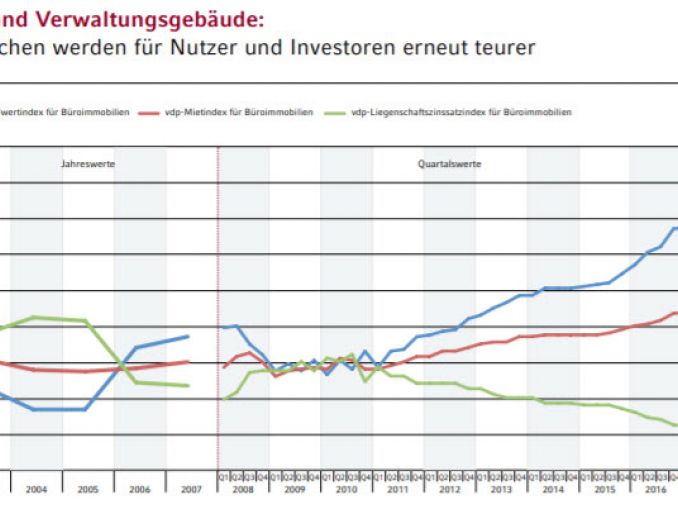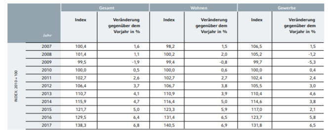 Auch für Gewerbeimmobilien vermeldeten die Statistiker des Instituts einen neue Rekordmarke. Investoren und Nutzer von Büro- und Verwaltungsgebäuden mussten 2017 8,4 % mehr zahlen als noch im Vorjahr. In den letzten sieben Jahren stiegen die Erwerbskosten um gut 43,6 %. Auch dieser Preisanstieg werde von einer Angebotsknappheit hervorgerufen. Büroflächen würden weiterhin nachgefragt, „während sich das Angebot an neuen Flächen durch die geringe Bautätigkeit erneut verknappte“, so Eilers.