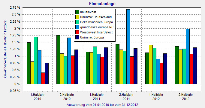 Ein Offener Immobilienfonds hat hingegen keinerlei Investitionen getätigt und verzeichnete als einziger Mittelabflüsse: Bis Oktober 2012 zogen Anleger 566 Millionen Euro aus dem hausInvest (ISIN: DE0009807016) der Investmentgesellschaft Commerz Real ab. Anlass zur Sorge biete dies aber keineswegs: „Die Mittelabflüsse ermöglichten es uns, leichte Übergewichtungen in unserem Portfolio abzubauen“, erläutert ein Commerz-Real-Sprecher gegenüber FundResearch. „Insgesamt sind wir gut durch das letzte Jahr gekommen.“ Der hausInvest verzeichnete 2012 eine Wertsteigerung von 2,49 Prozent. Verwaltet wird 9,32 Milliarden Euro starke Fonds von Mario Schüttauf. Die Dreijahresperformance zeigt ein sehr ordentliches Plus von 8,59 Prozent. Mit 23,5 Prozent investiert Schüttauf fast ein Viertel des Fondsvolumens in Objekte in Frankreich. Auf Großbritannien entfallen 18,5 Prozent und auf Deutschland 17,6 Prozent. Besonders interessant: Der hausInvest trägt das Scope-Rating „A“ und kann auch von unabhängigen Beratern eingesetzt werden, wird also nicht primär über Sparkassen oder Raiffeisenbanken vertrieben. Zudem lieferte er in den vergangenen zwei „Krisen“-Jahren ausgewogene gute Halbjahres-Ergebnisse (siehe Chart).