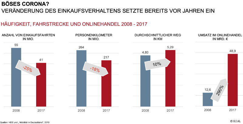 Ein Blick auf die zeitliche Länge der Einkaufsfahrten zeige, wie genau sich das Einkaufsverhalten in den vergangenen Jahren insgesamt verändert habe, auch unabhängig von Corona. „Die Anzahl der Einkaufsfahrten hat sich zwischen 2008 und 2017 um ein Viertel reduziert. Gleichzeitig ist die Strecke, die die Menschen zum Einkaufsziel zurücklegen, um zehn Prozent gewachsen. Warum ist das so? Weil die Leute offensichtlich gezielt dorthin fahren, wo sie etwas ganz Bestimmtes, Besonderes bekommen. Der Standardeinkauf wandert also immer mehr ins Onlinegeschäft ab. Die Gewinner im stationären Handel sind dafür die spezialisierten Fachmarktzentren und Geschäfte in Quartierslagen, also ein REWE oder ALDI in den Wohnquartieren“, erklärt Axel Drwenski. Wenn die Menschen in der Stadt normal einkaufen gingen, dann eher bei sich um die Ecke. Wer etwas außerhalb wohne, würde für den Standardeinkauf nicht mehr extra in die Stadt fahren.