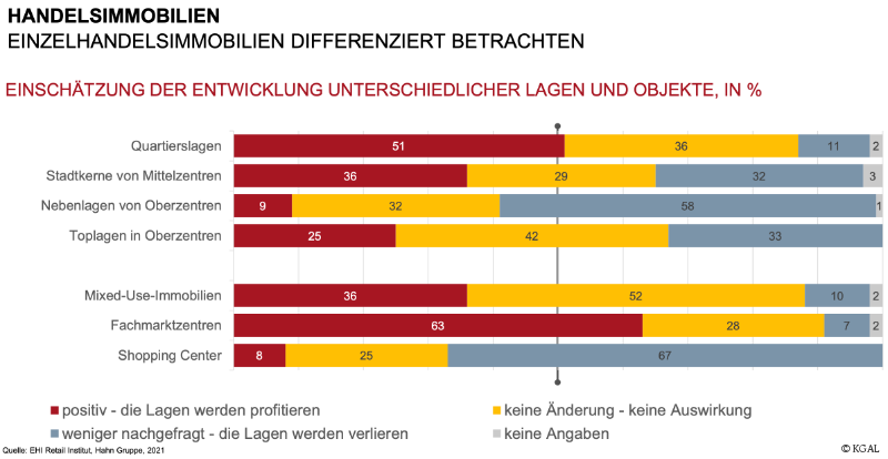 Die Entwicklung habe auch in der Immobilienbranche für ein Umdenken gesorgt. Einer Umfrage unter Immobilienexperten zufolge seien Shoppingcenter als Investitionsobjekte mittlerweile kaum noch gefragt. Dafür seien Büroimmobilien wieder attraktiver. „Vor drei bis fünf Jahren war das noch ganz anders. Die durchschnittliche Shoppingmall in Stadtrandlage ist heute out. Shoppingcenter in Innenstadtlagen mit Erlebnisfeeling dagegen bieten der Umfrage zufolge noch Perspektiven. Auch Fachmarktcenter wie Baumarkt, Tiernahrung und Drogerie nebeneinander ziehen immer noch“ so Drwenski.