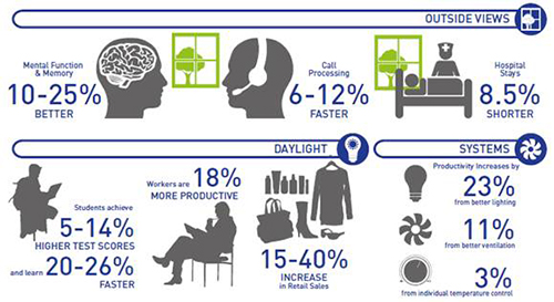 Die meisten Menschen verbringen durchschnittlich 90 Prozent ihrer Zeit in Räumen. Da die Qualität der Raumluft oft schlechter ist als die Luft draußen, geht der soziale Nutzen von Gebäuden der nächsten Generation über ökologische Vorteile hinaus. Die Qualität der Innenraumluft und der Fokus auf körperliche Bewegung sind für Gesundheit und Wohlbefinden der Beschäftigten von entscheidender Bedeutung. Fenster, die den Blick nach außen zulassen, Tageslicht bzw. LED-Beleuchtung, dessen Wellenlänge der des Tageslichts entspricht, sowie eine personalisierte Umgebung tragen ebenfalls maßgeblich zur Produktivität bei (vgl. Grafik).