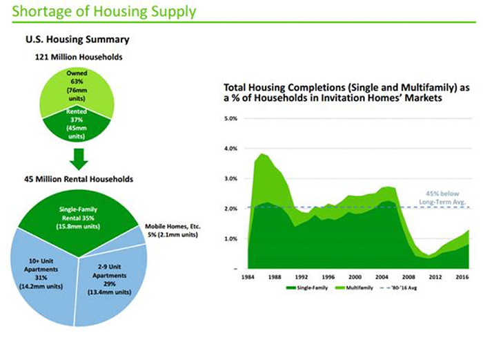 The high cost of city living and relatively short supply of urban family homes suggests that millennials will continue to rent as they move. This presents a significant opportunity for companies exposed to the single-family rental home market.