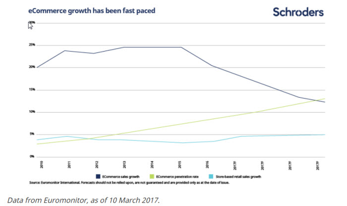 The charts below are based on data published by Euromonitor International and capture the growth of ecommerce.