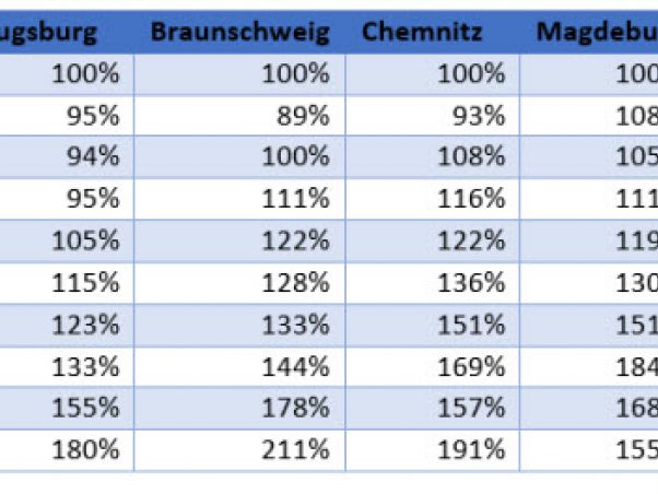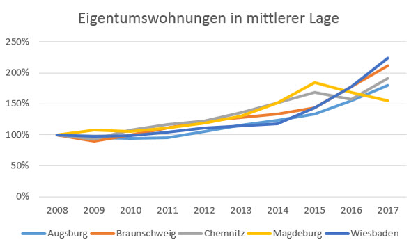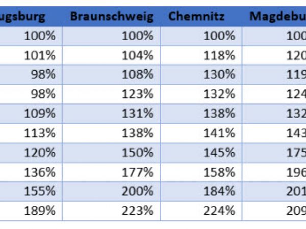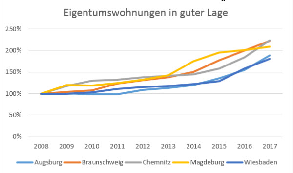 Zu beachten sind dabei die unterschiedlichen Ausgangsniveaus der Immobilienwertberechnungen. Der Quadratmeterpreis startet 2007 in Augsburg bei 2035 EUR, in Wiesbaden bei 2345 EUR. In Chemnitz lagen die Preise 2007 bei nicht einmal der Hälfte. Pro Quadratmeter mussten hier 760 EUR aufgewendet werden. Ähnlich in Magdeburg, wo 945 EUR aufgerufen wurden. Braunschweig nimmt hier eine Mittelstellung ein (1300 EUR/qm).