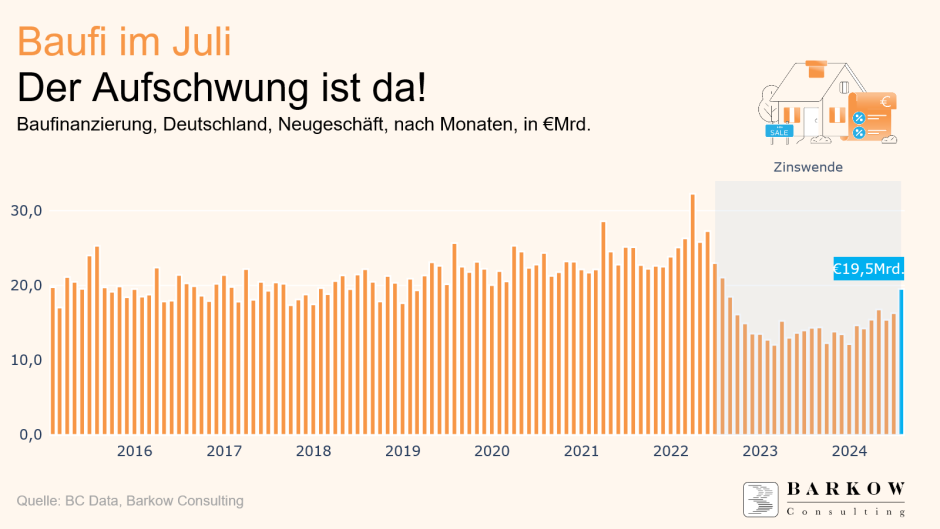 Das Neu-Baufinanzierungsgeschäft steigt im Juli auf über 19 Milliarden Euro. Das ist der beste Wert seit zwei Jahren.