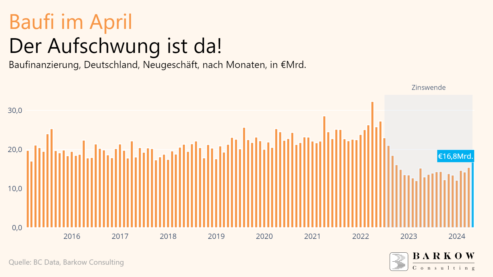 Das Volumen der neu vergebenen Hypothekarkredite erreichte laut Barkow Consulting im April 2024 mit 16,8 Milliarden Euro den höchsten Wert seit dem Einbruch nach der Zinswende.