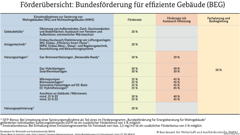 Nach dem Beginn der BEG im Januar 2021 mit Zuschüssen für Einzelmaßnahmen beim Bundesamt für Wirtschaft und Ausfuhrkontrolle (BAFA) startete die BEG am 1. Juli 2021 nun auch bei der Kreditanstalt für Wiederaufbau (KfW) mit der Kreditförderung für Einzelmaßnahmen und der Effizienzhaus-Förderung im Neubau- und Sanierungsbereich. Sie gilt für alle Wohngebäude, zum Beispiel für Eigentumswohnungen, Ein- und Mehrfamilienhäuser oder Wohnheime sowie für alle Nichtwohngebäude, also auch für Gewerbegebäude, kommunale Gebäude oder Krankenhäuser.