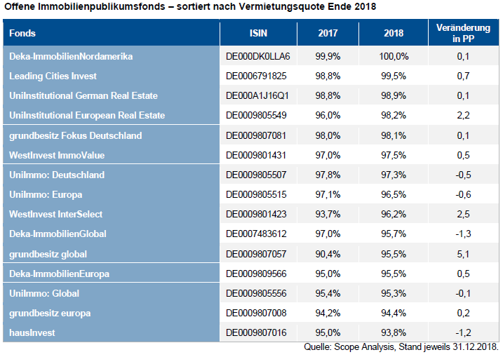 Aufgrund der natürlichen Mieterfluktuation betrachtet Scope Vermietungsquoten ab 98 Prozent als Vollvermietung. Diese Schwelle nehmen aktuell fünf der 15 Fonds. Das Spektrum der Vermietungsquote reicht derzeit von 93,8 Prozent beim hausInvest bis zu 100 Prozent beim Deka-ImmobilienNordamerika.