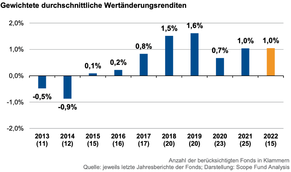Und da wäre dann noch der dritte Performancefaktor: die Liquiditätsrendite. Diese lag 2023 im Durchschnitt laut Scope-Analyse bei minus 1,9 Prozent. Zu diesem schlechten Wert trugen insbesondere Fonds bei, die ihre flüssigen Mittel überwiegend in Anleihen investiert hatten, die im Zuge des Zinsanstiegs im vergangenen Jahr zum Teil massiv abwerteten. Wie die Rechnung für das Jahr 2023 aussehen wird, muss sich noch zeigen. Am Ende könnte sogar ein positiver Wert stehen. Die negativen Entwicklungen der beiden oben genannten Performancefaktoren dürfte er jedoch nicht ausgleichen.