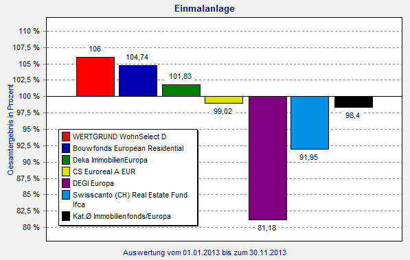 Interessant ist der Blick in die Vergleichsgruppe. Denn mit offenen Immobilienfonds war durchaus Rendite zu machen. In der Peergroup „Immobilienfonds Europa“ sind 32 Fonds gelistet, von denen 14 im laufenden Jahr eine positive Wertentwicklung verzeichnen. Es dominieren Fonds, die auf Wohnimmobilien setzen. FundResearch berichtete bereits im März über dieses für Finanzberater durchaus attraktive Segment der Immobilienfonds. Top-Performer der Europa-Vergleichsgruppe ist der WERTGRUND WohnSelect (ISIN: DE000A1CUAY0) von TMW Pramerica Property. Der rund 400 Millionen Euro große Fonds steigerte seinen Wert um glatte sechs Prozent. Auf Rang zwei liegt der Bouwfonds European Residential (ISIN: DE000A0M98N2) von Catella Real Estate. Fondsmanager Xavier Jongen kommt in den ersten elf Monaten 2013 auf ein Plus von 4,7 Prozent. Ein Interview mit Jongen ist hier zu finden. Auch Deka-Anleger können zufrieden sein: Der Deka Immobilien Europa (ISIN: DE0009809566) erzielt per Ende November eine Wertsteigerung von 1,8 Prozent.