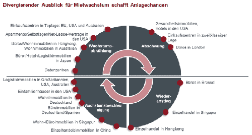 Unter Berücksichtigung all dieser Faktoren bleiben wir bei unserer Einschätzung, dass wir mit moderateren Renditen rechnen, die vornehmlich von Mieteinnahmen – oder Dividenden bei einer Anlage in REITs – und Ertragswachstum bestimmt werden. Aber zugleich sind die Fundamentaldaten der Immobilienmärkte unverändert solide, und es deutet praktisch nichts auf eine Übertreibung hin. Folglich sollte die starke Nachfrage der Anleger nach Immobilien zu Anlagezwecken anhalten. Schließlich handelt es sich bei ihnen um Sachwerte mit attraktiven und steigenden Ertragsströmen. Die Zinsen und Anleihenrenditen werden zwar wahrscheinlich weiter steigen, da die quantitative Lockerung zurückgefahren und schließlich rückgängig gemacht wird. Der Renditeabstand zwischen Immobilien und Anleihen liegt jedoch nach wie vor über dem historischen Durchschnitt und bietet einen gewissen Puffer. In einigen Teilen der Welt befinden wir uns zwar inzwischen in einer späteren Phase des Immobilienzyklus. Gleichwohl gibt es nach wie vor Länder, Städte und Sektoren, in denen sich die Aussichten voraussichtlich weiter aufhellen werden und die uns daher interessant erscheinen. In unserer Immobilienuhr haben wir den Zyklus an den Immobilienmärkten grafisch dargestellt.