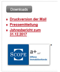 Für Ihre Gespräche mit den Anlegern empfehlen wir Ihnen unseren neuen Jahresbericht zum 31. Dezember 2017, der in der Druckversion bestellbar ist. Hier finden Sie im Gespräch mit dem Anleger sehr transparent unsere Investitionsstrategie, eine ausführliche Beschreibung der im abgelaufenen Geschäftsjahr neu erworbenen Objekte sowie den gesamten Immobilienbestand und selbstverständlich den Hinweis auf das Fondsrating-Upgrade durch Scope auf »a+ AIF«.