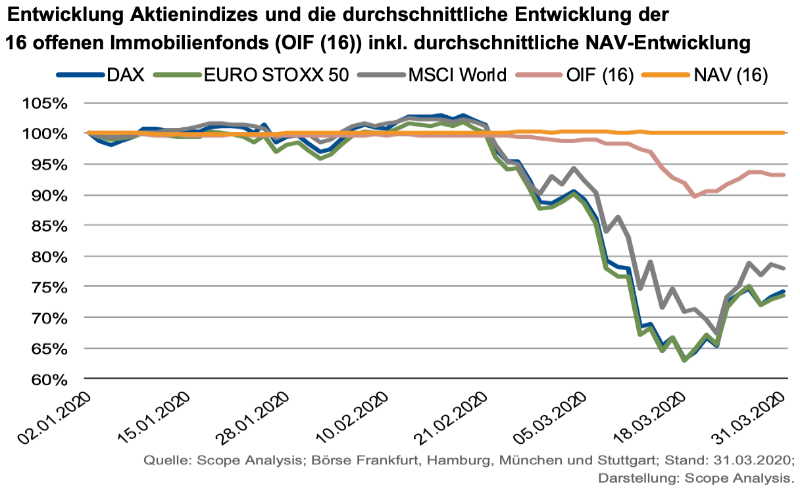 Prognosen sind in diesen Zeiten schwer. Wie schnell sich nahezu Alles innerhalb nur weniger Wochen verändern kann, hat die Welt gerade erlebt. Auch Börsianer durften zuletzt dazulernen. Höhenflug, Blitzcrash, Turnaround und Konsolidierung folgten von Anfang März bis Mitte April im Stakkato. Insbesondere Aktien und Aktienfonds gehörten in der Corona-Krise bisher zu den Verlierern. Immobilienfonds dagegen machten ihrem Namen alle Ehre. So immobil wie die in den Fonds versammelten Gebäude blieben auch die Kurse. So verzeichneten offene Immobilienfonds in den ersten drei Monaten 2020 im Durchschnitt einen Wertzuwachs von +0,3 Prozent. Die durchschnittliche 1-Jahres-Wertentwicklung betrug zu Ende März +2,7 Prozent. Das ergab eine Untersuchung der Ratingagentur Scope.