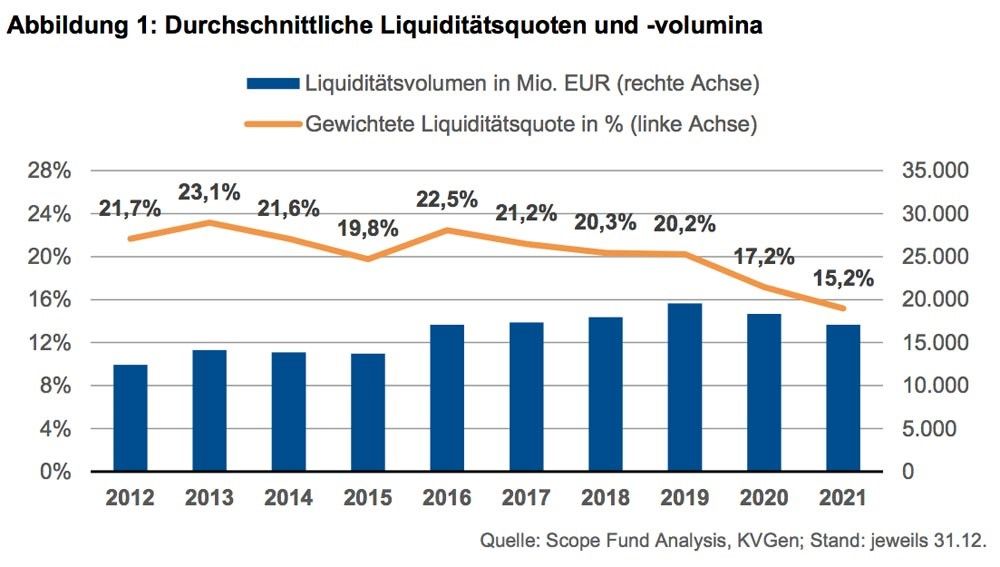 Wie die Wirtschaftskrise 2001 und die Finanzkrise 2008 zeigten, sind Investments in Immobilien zeitverzögert von Rezessionen betroffen. Aufgrund der gesunkenen Fondsausschüttungen wollten damals viele Anleger ihre Fondsanteile zurückgeben, was zur Liquiditätsengpässen bei den Fonds führte, die nicht so schnell ihre Immobilien zu fairen Preisen verkaufen konnten. In Folge der Fondskrise 2004 und nach der Finanzkrise 2008 mussten zahlreiche Offene Immobilienfonds abgewickelt werden. Ende 2021 lag die Liquiditätsquote Offener Immobilienfonds laut einer Auswertung der Ratingagentur Scope in ihrer Studie „Offene Immobilienfonds“ vom Frühjahr 2022 im Mittel bei 15,7 Prozent. Die Liquiditätsreserve ist seit dem Höchststand im Jahr 2013 von durchschnittlich 23,1 Prozent damit um 7,9 Prozentpunkte gesunken (siehe Grafik 2).