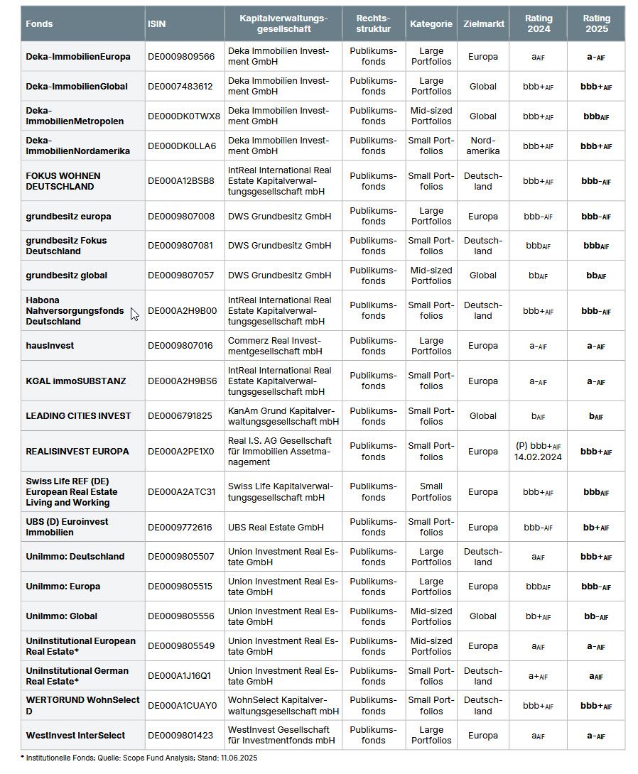 Scope-Ratingübersicht 2025 der offenen Immobilienfonds