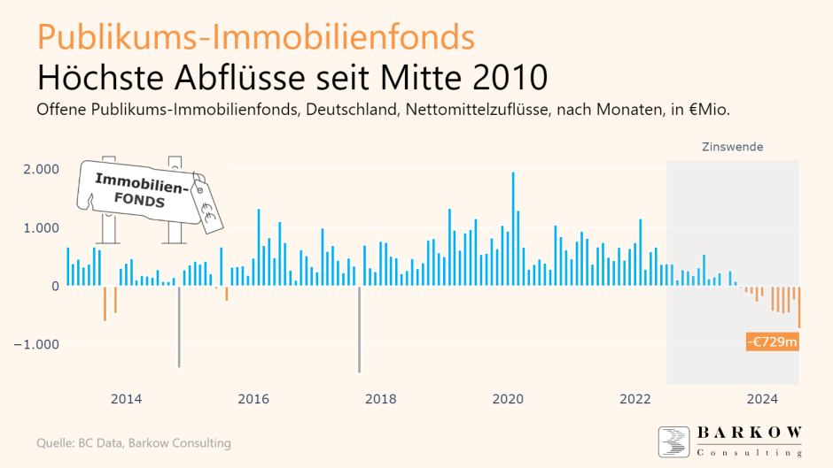 Offene Immobilien-Publikumsfonds mussten laut Barkow Consulting im Juli zum zwölften Mal in Folge Nettomittelabflüsse hinnehmen. Diese beliefen sich auf minus 729 Millionen Euro und erreichten damit einen neuen Höchststand seit Mitte 2010.