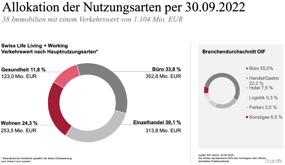 Bei Wohnimmobilien sehe es ein wenig anders aus. Da hingen Investoren der Inflationsentwicklung hinterher. Bei einem Immobilienportfolio komme es also darauf an, wieviel Prozent des Portfolios auf indexierte Mietverträge entfallen. Oder über andere Mietanpassungsklauseln verfügen. Hier sei der Swiss Life Living + Working gut aufgestellt. Der Fonds verfüge über rund 88 Prozent indexierte Mietverträge. Beim Rest seien teilweise Staffeln und ähnliche Instrumente vorhanden. Dies führe dazu, dass die Vertragsstruktur die Inflation auffange und der Wert des Portfolios insgesamt steige. Der Liegenschaftszins, die Bewertung für die Immobilie in der Zukunft, steige. Das bedeute in der Regel steigende Anteilswerte im Kundendepot. Im Moment reagiere dieser Faktor allerdings noch nicht auf die Entwicklung.