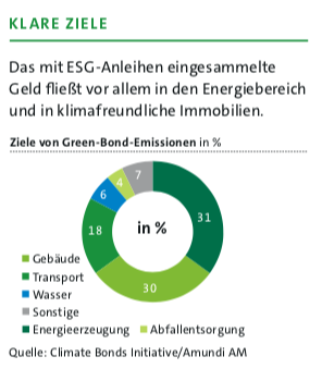 Zudem müssen die Emittenten gemäß Green Bond Principles einen Jahresbericht veröffentlichen und die Bereiche offenlegen, denen die Erlöse zugeflossen sind. Zulässig sind unter anderem erneuerbare Energien, Energieeffizienz, grüne Gebäude und umweltfreundlicher Transport. Manche Anleihen sind also direkt Umwelt- oder Klimaprojekten zugeordnet, andere finanzieren Tranchen von mehreren Projekten, und wieder andere sind einfach von Firmen aus der Umweltbranche emittierte Unternehmensanleihen.