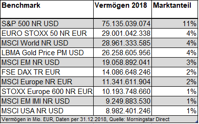 Was kaum überrascht: Es handelt sich ausschließlich um Klassiker: S&P 500, Euro Stoxx 50, MSCI World und Co. sind seit Jahrzehnten bekannt. Viele Anleger investieren offensichtlich nach dem Adenauer´schen Motto: Nur keine Experimente.