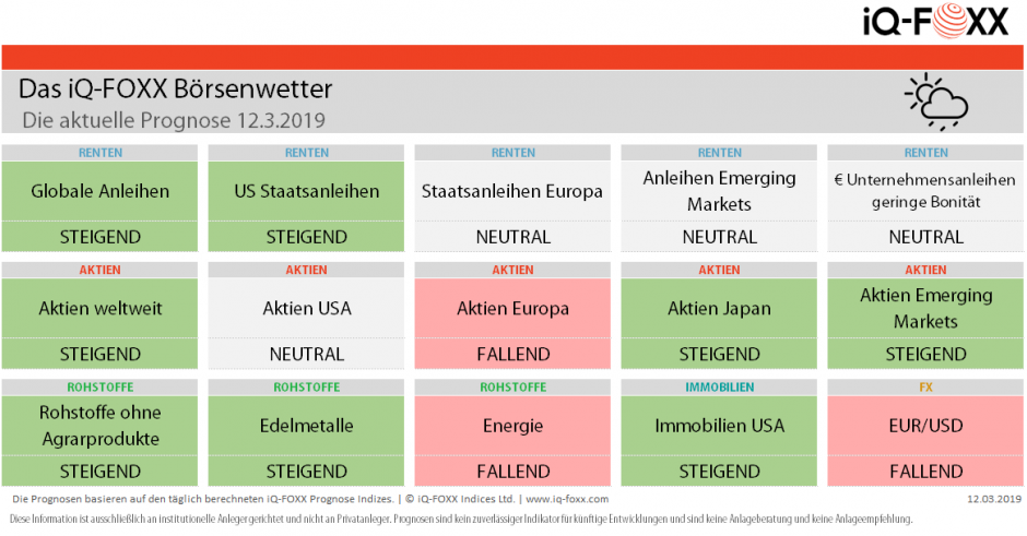 Das iQ-FOXX Börsenwetter basiert auf den täglich berechneten Prognose-Indizes von iQ-FOXX. Die Signale können zur Steuerung der Investitionsquote einzelner Märkte verwendet werden