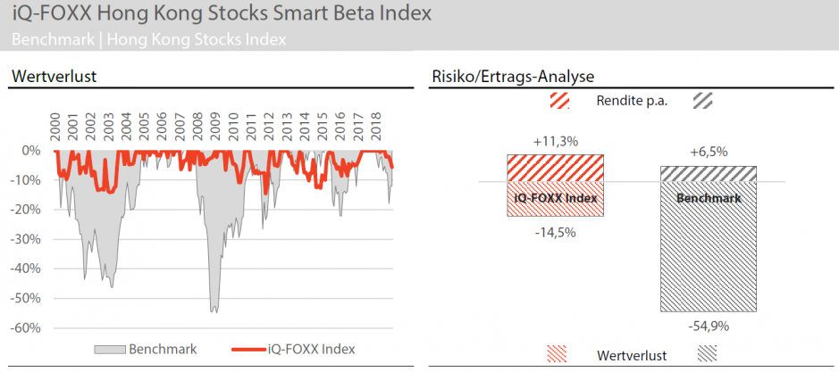 „Unsere Kunden setzen iQ-FOXX smart BETA Indizes zur Steuerung des Risikos in den asiatischen Märkten ein und waren sehr zufrieden.“, sagt René Danzinger, Managing Partner beim Index-Spezialist iQ-FOXX. Der iQ-FOXX Chinese Stocks smart BETA Index korrigierte im Jahr 2018 um 10%, das ist weniger als die Hälfteim Vergleich zum Gesamtmarkt (-21%). Der iQ-FOXX Hong Kong Stocks smart BETA Index rettete sogar ein deutlich positives Ergebnis ins Ziel – stand doch mit +4,2% per Jahresende 2018 ein dickes Plus in der Abrechnung.