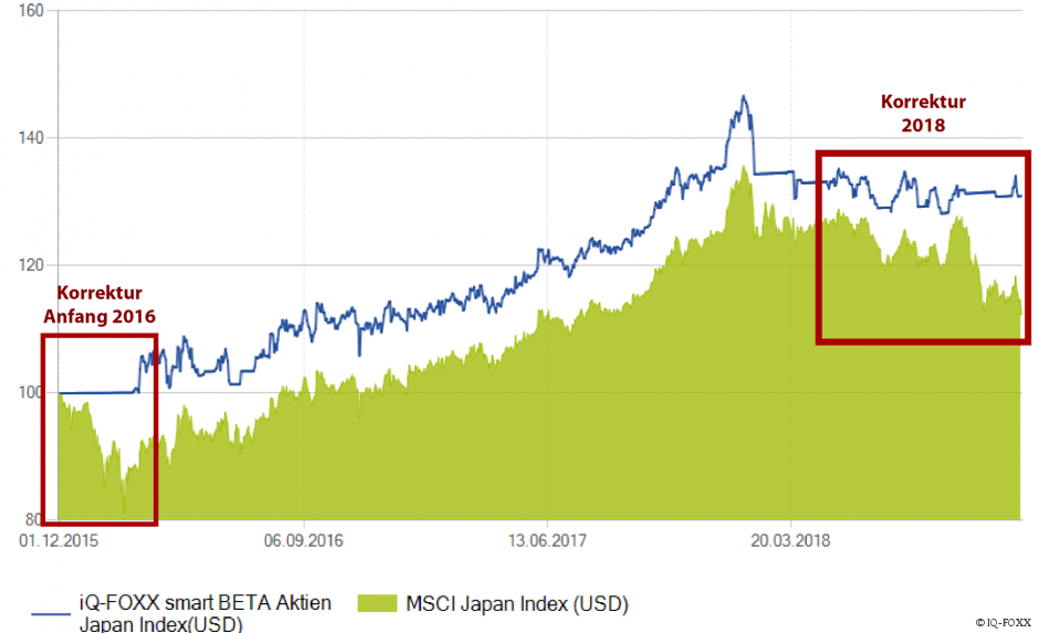 Beginnend mit der Korrektur der weltweiten Aktienmärte Anfang des Jahres 2016 verzeichnete auch der japanische Aktienmarkt einen herben Kursrückgang. Der Aktieneinbruch zu Beginn des Jahres 2016, der viele Fondsmanager am falschen Fuß erwischte, ging am iQ-FOXX Index spurlos vorüber. Die gewünschte Absicherungsfunktion wurde erfüllt und bewahrte das Portfolio im Segment japanische Aktien sowohl 2016 als auch 2018 vor einem Verlust.