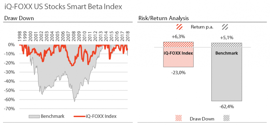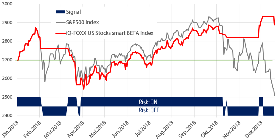 Der iQ-FOXX US Stocks smart BETA Index hat den starken Kursrückgang dank eines Risk-OFF Signals ab dem 4. Dezember vermieden. Die Eigenschaft, der iQ-FOXX smart BETA Indizes, vor Kursverlusten zu schützen, reduziert langfristig sowohl die Volatilität als auch den maximalen Wertverlust. Im konkreten Fall des US-Aktienmarktes kann iQ-FOXX das positive Gesamtergebnis für das Jahr 2018 retten.