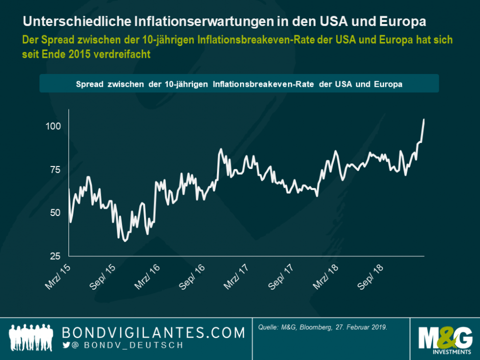 Vor diesem Hintergrund macht die Spreadausweitung der amerikanischen gegenüber der europäischen Inflationserwartung durchaus Sinn. Ich würde jedoch behaupten, dass das Ausmaß der Bewegung ziemlich extrem war. Vergleicht man die 10-jährigen Inflationsbreakeven-Raten, einen Marktproxy für die mittelfristigen Inflationserwartungen, so ist die Differenz zwischen den inflationssicheren US-Staatsanleihen (TIPS) und den deutschen Bund-Linkern (die sich auf die Inflation im Euroraum beziehen) auf über 100 Basispunkte (bps) gestiegen. Um die Zusammenhänge zu verdeutlichen, hat sich der 10-jährige Breakeven-Spread zwischen den USA und Europa seit Ende 2015 mehr als verdreifacht.