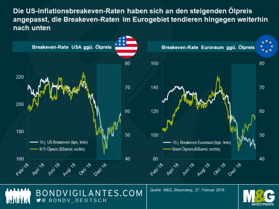 Hervorzuheben ist auch, wie unterschiedlich sich die Inflationserwartungen der USA und des Euroraums während der jüngsten Erholung des Ölpreises entwickelt haben. Während die 10-jährigen US-Breakevens in diesem Jahr angestiegen sind (+25 Basispunkte seit Jahresbeginn), zeigten sich die 10-jährigen Breakevens im Euroraum völlig unbeeindruckt und tendierten weiter nach unten (-7 Basispunkte seit Jahresbeginn). Zugegeben, aufgrund niedrigerer Treibstoffzölle in den USA haben Ölpreisbewegungen zumindest über einen kurzen Zeitraum direktere Auswirkungen auf die Inflationszahlen der USA als auf die europäischen Inflationsraten. Wir sollten jedoch lange und gründlich darüber nachdenken, ob der hohe Grad der Korrelation zwischen 10-jährigen US-Breakevens und den Spotpreisbewegungen von Rohöl gerechtfertigt ist. Wenn der Ölpreis in den nächsten zehn Jahren nicht Jahr für Jahr weiter steigt, werden Basiseffekte einsetzen, die die inflationären Auswirkungen der jüngsten Ölpreiserholung eher kurzlebig machen.