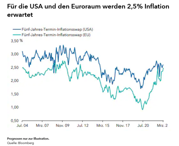 Gemessen an den 5-jährigen Inflationsswap-Terminkontrakten wird die Verbraucherpreisinflation in den USA und im Euroraum auf etwa 2,5% zurückgehen.
