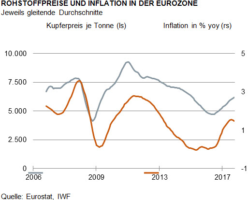 Die Grafik zeigt am Beispiel von Kupfer, wie die hohen Rohstoffpreise 2008 und dann wieder 2011 die generelle Inflationsrate nach oben gezogen haben. Auch die Zunahme der Geldentwertung in den letzten Monaten hat etwas mit den Rohstoffpreisen zu tun. Ich vermute, dass das im weiteren Verlauf des Jahres so weitergeht.
