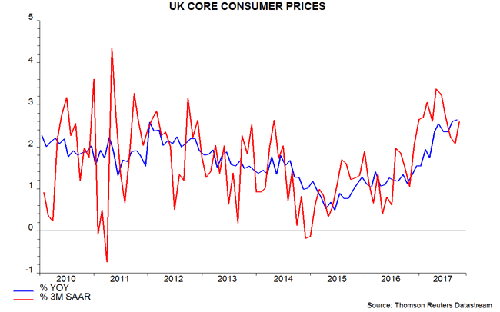 Core prices are still rising at an above-target pace. The core measure monitored here excludes energy, food, alcohol, tobacco and education, and adjusts for historical VAT changes. Seasonally adjusted, core prices rose by 0.2% between August and September and at a 2.6% annualised rate in the latest three months – see chart.