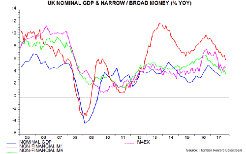 Annual money growth, however, peaked in late 2016 and trended lower during 2017. December numbers released in late January – the first to reflect a full month at the higher level of Bank rate – showed a further significant step down. Annual expansion of non-financial broad and narrow money is the lowest since 2012. The monetary slowdown has been reflected in a moderation of nominal GDP growth.