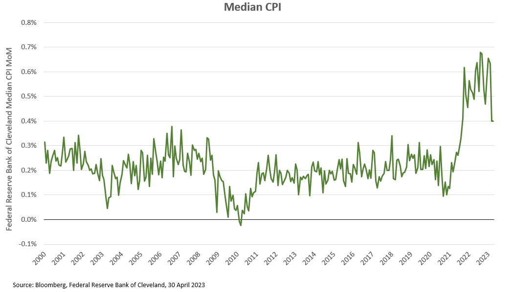 1. Der Inflationsdruck lässt nach: Es sind nicht nur einige wenige Posten, die die Gesamtinflation nach unten drücken, sondern es handelt sich um einen breiteren Trend. In immer mehr Kategorien lässt der Druck nach und bewegt sich in die richtige Richtung. Dies wird besonders deutlich, wenn man den Median des Verbraucherpreisindex betrachtet, der sich auf den Kern der Verteilung konzentriert und die durch Ausreißer verursachten Störungen vermeidet.